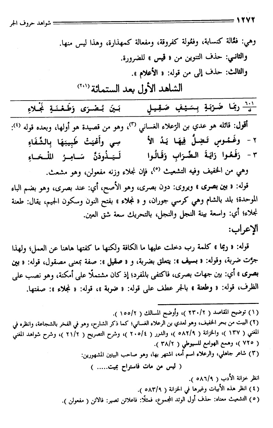 (¬2) البيت من بحر الخفيف، وهو لعدي بن الرعلاء الغساني؛ كما ذكر الشارح، وهو في الفخر بالشجاعة، وانظره في المغني (137)، والخزانة (9/ 582)، والدرر (4/ 205)، وشرح التصريح (2/ 21)، وشرح شواهد المغني (725)، وهمع الهوامع للسيوطي (2/ 38).