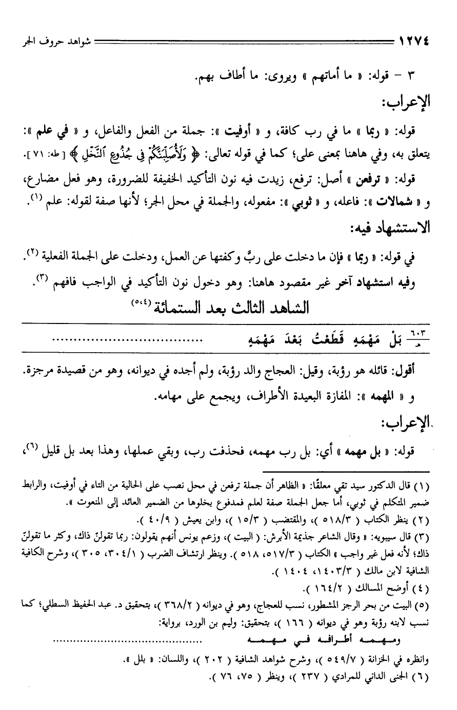 (¬1) قال الدكتور سيد تقي معلقًا: "الظاهر أن جملة ترفعن في محل نصب على الحالية من التاء في أوفيت، والرابط ضمير المتكلم في ثوبي، أما جعل الجملة صفة لعلم فمدفوع بخلوها من الضمير العائد إلى المنعوت".