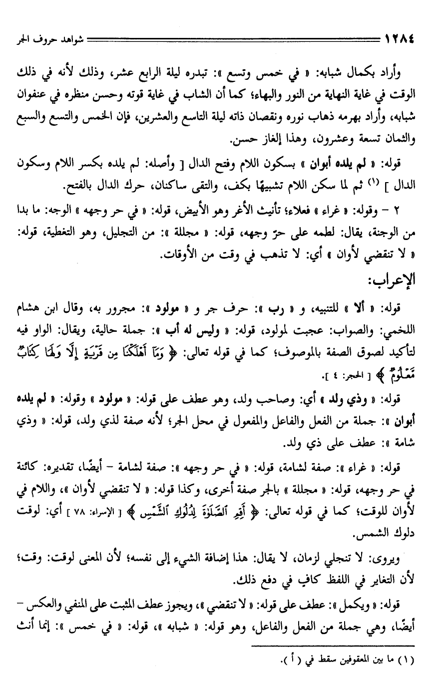 وأراد بكمال شبابه: "في خمس وتسع": تبدره ليلة الرابع عشر، وذلك لأنه في ذلك الوقت في غاية النهاية من النور والبهاء؛ كما أن الشاب في غاية قوته وحسن منظره في عنفوان شبابه، وأراد بهرمه ذهاب نوره ونقصان ذاته ليلة التاسع والعشرين، فإن الخمس والتسع والسبع والثمان تسعة وعشرون، وهذا إلغاز حسن.