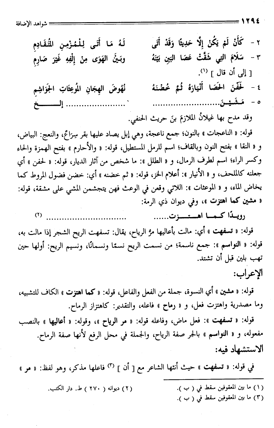 قوله: "الناعجات" بالنون؛ جمع ناعجة، وهي إبل يصاد عليها بقر سِرَاعٌ، والنعج: البياض، و"النقا" بفتح النون وبالقاف؛ اسم للرمل المستطيل، قوله: "والأحارم" بفتح الهمزة والحاء وكسر الراء؛ اسم لطرف الرمال، و"الطلل": ما شخص من آثار الديار، قوله: "لحفن" أي جعلنه كالملحف، و"الأنيار": أعلام الخز، قوله: "ثم خضنه" أي: خضن فضول المروط كما يخاض الماء، و"الموعثات": اللائي وقعن في الوعث فهن يتجشمن المشي على مشقة، قوله: "مشين كما اهتزت"، وفي ديوان ذي الرمة: