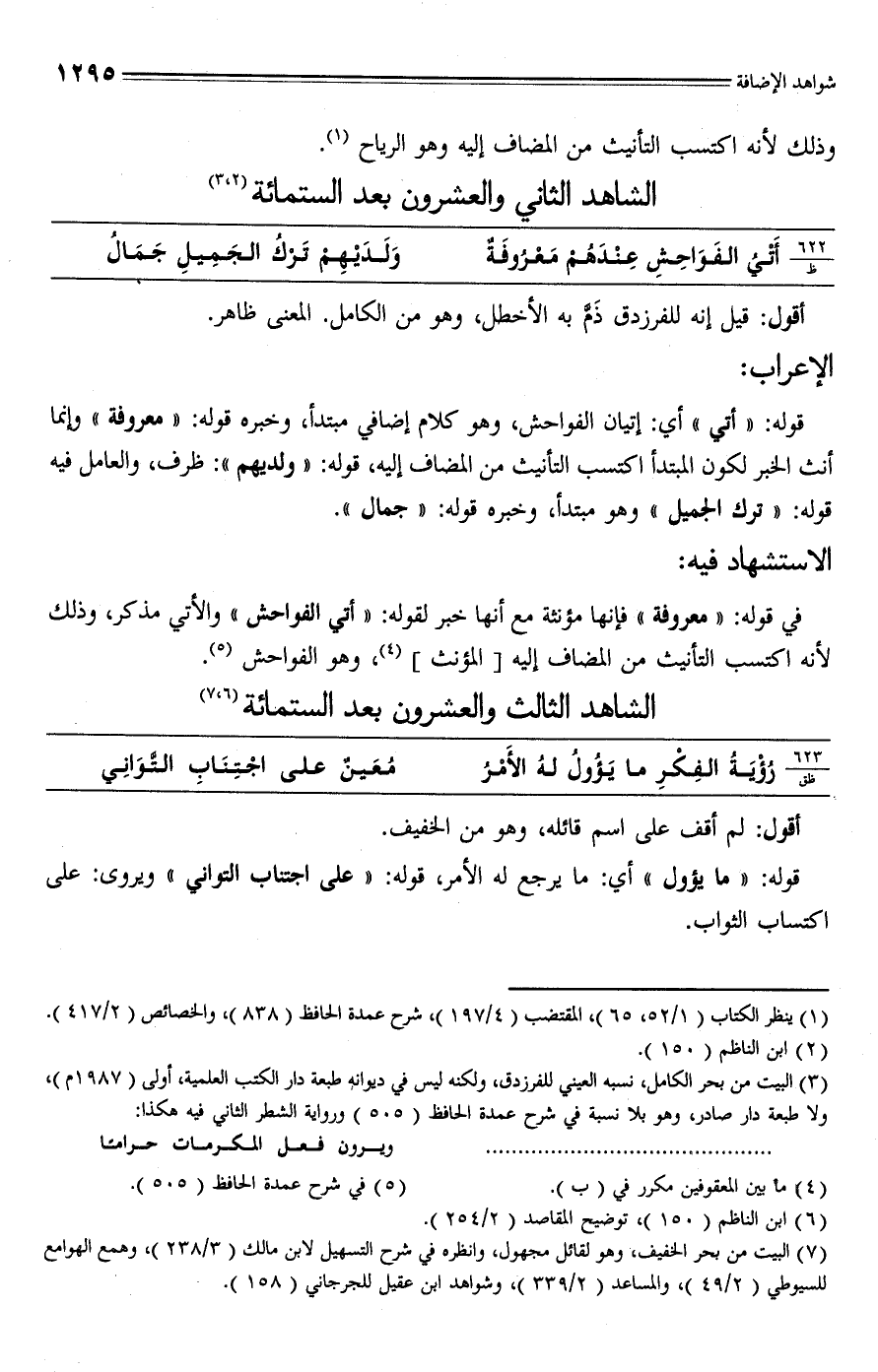 (¬3) البيت من بحر الكامل، نسبه العيني للفرزدق، ولكنه ليس في ديوانه طبعة دار الكتب العلمية، أولى (1987 م)، ولا طبعة دار صادر، وهو بلا نسبة في شرح عمدة الحافظ (505) ورواية الشطر الثاني فيه هكذا: