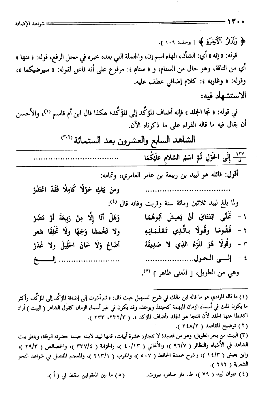 (¬3) البيت من بحر الطويل، وهو من قصيدة لا تتجاوز عشرة أبيات، قالها لبيد لابنته حينما حضرته الوفاة، وينظر بيت الشاهد في الأشباه والنظائر (7/ 96)، والأغاني (13/ 40)، والخزانة (4/ 337)، والخصائص (3/ 29)، وابن يعيش (3/ 14)، وشرح عمدة الحافظ (507)، والمقرب (1/ 213)، والمعجم المفصل في شواهد النحو الشعرية (292).