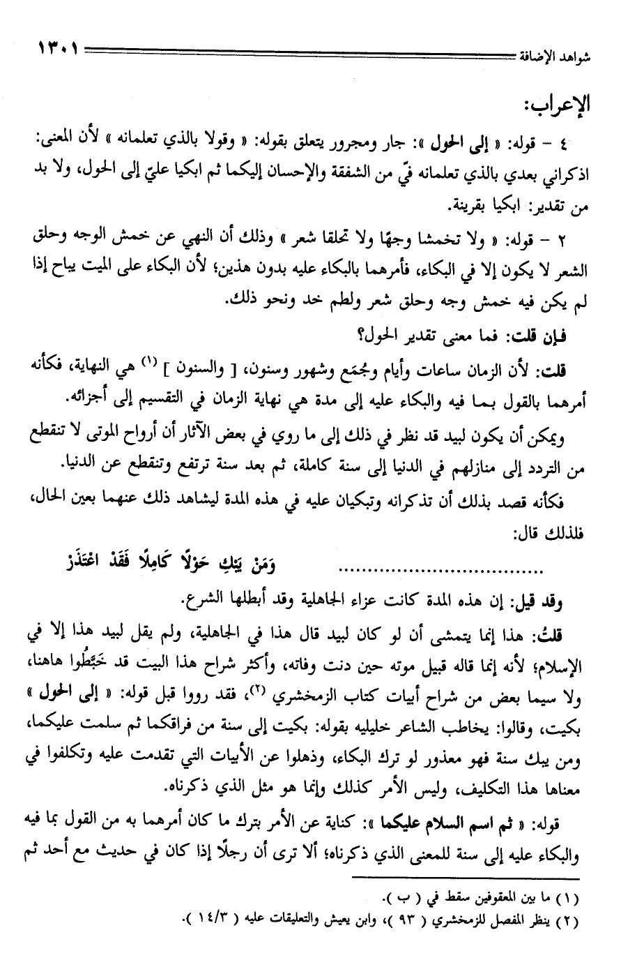 قلتُ: هذا إنما يتمشى أن لو كان لبيد قال هذا في الجاهلية، ولم يقل لبيد هذا إلَّا في الإِسلام؛ لأنه إنما قاله قبيل موته حين دنت وفاته، وأكثر شراح هذا البيت قد خَبَّطُوا ها هنا، ولا سيما بعض من شراح أبيات كتاب الزمخشري (¬2)، فقد رووا قبل قوله: "إلى الحول" بكيت، وقالوا: يخاطب الشَّاعر خليليه بقوله: بكيت إلى سنة من فراقكما ثم سلمت عليكما، ومن يبك سنة فهو معذور لو ترك البكاء، وذهلوا عن الأبيات التي تقدمت عليه وتكلفوا في معناها هذا التكليف، وليس الأمر كذلك وإنما هو مثل الذي ذكرناه.
