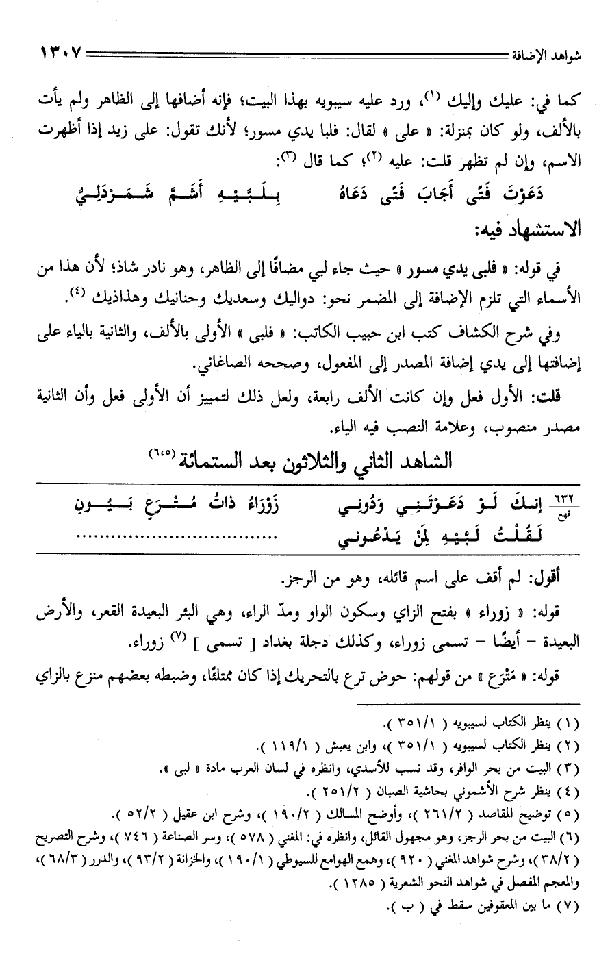 في قوله: "فلبى يدي مسور" حيث جاء لبي مضافًا إلى الظاهر، وهو نادر شاذ؛ لأن هذا من الأسماء التي تلزم الإضافة إلى الضمر نحو: دواليك وسعديك وحنانيك وهذاذيك (¬4).