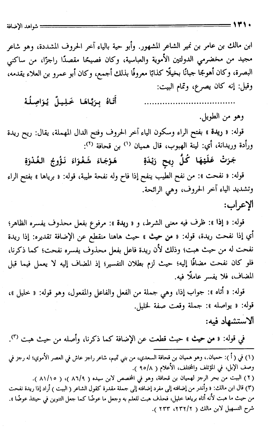 (¬3) قال ابن مالك: "وأندر من إضافته إلى مفرد إضافته إلى جملة مقدرة كقول الشَّاعر (البيت) أراد إذا ريدة نفحت من حيث ما هبت لأنه أتاه برياها خليل، فحذف هبت للعلم به وجعل ما عوضًا كما جعل التنوين في حينئذ عوضًا".