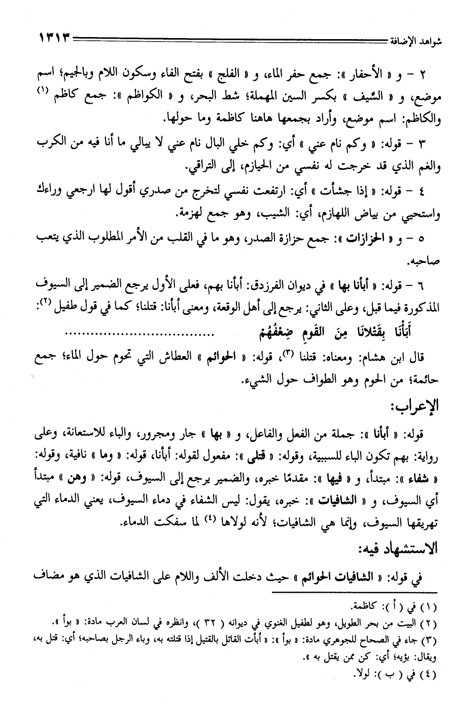 6 - قوله: "أبأنا بها" في ديوان الفرزدق: أبأنا بهم، فعلى الأول يرجع الضمير إلى السيوف المذكورة فيما قبل، وعلى الثاني: يرجع إلى أهل الوقعة، ومعنى أبأنا: قتلنا، كما في قول طفيل (¬2):