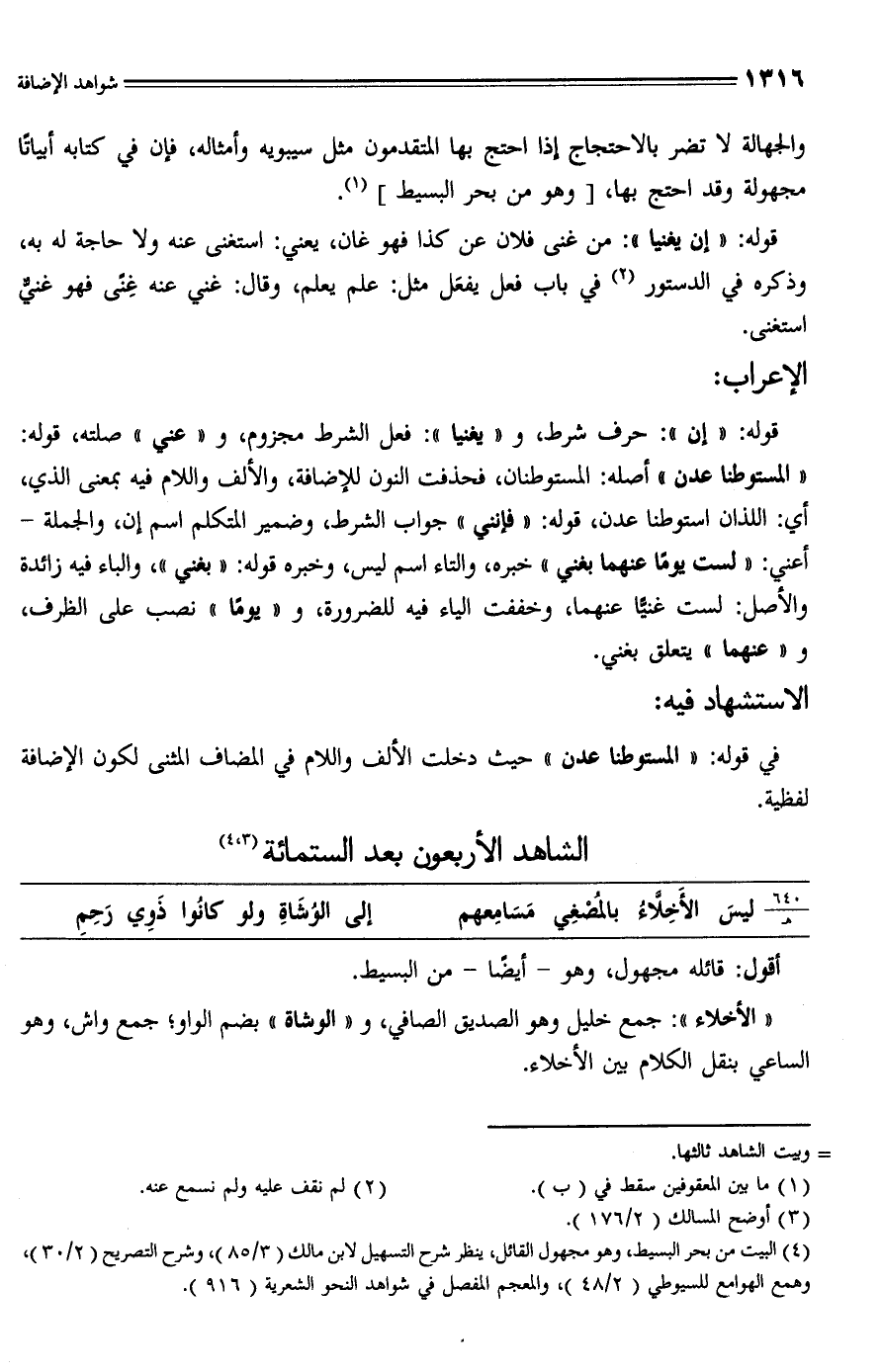 (¬4) البيت من بحر البسيط، وهو مجهول القائل، ينظر شرح التسهيل لابن مالك (3/ 85)، وشرح التصريح (2/ 30)، وهمع الهوامع للسيوطي (2/ 48)، والمعجم المفصل في شواهد النحو الشعرية (916).
