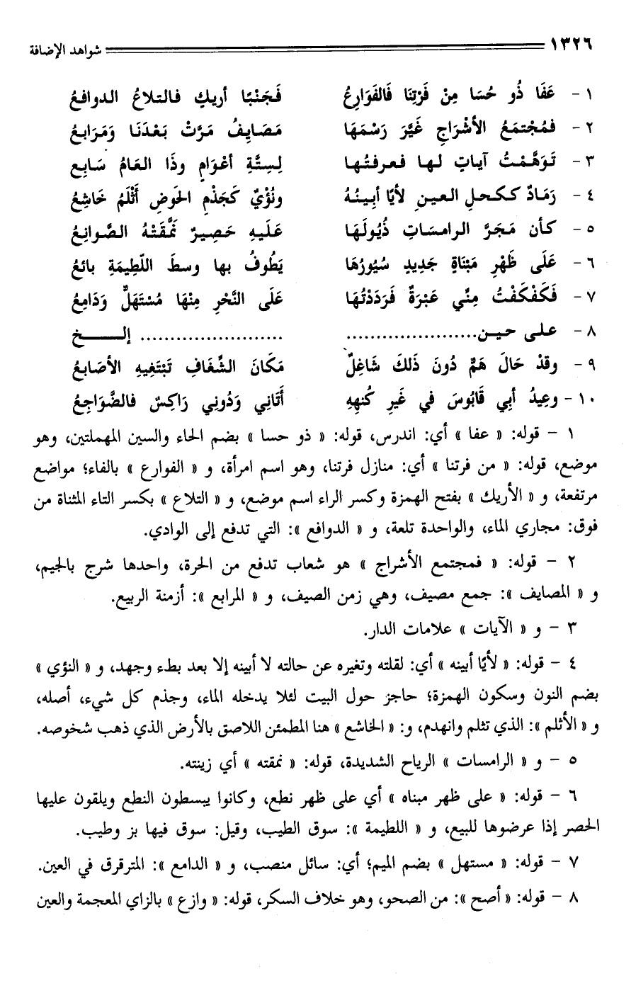 1 - عَفَا ذُو حُسَا مِنْ فَرْتِنَا فَالفَوَارِعُ ... فَجَنْبًا أريكٍ فالتلاعُ الدوافعُ