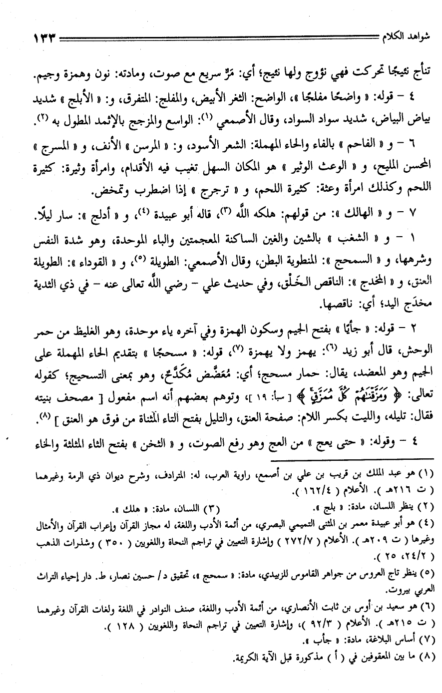 6 - و "الفاحم" بالفاء والحاء المهملة: الشعر الأسود، و: "المرسن" الأنف، و"المسرج" المحسن المليح، و "الوعث الوثير" هو المكان السهل. تغيب فيه الأقدام، وامرأة وثيرة: كثيرة اللحم وكذلك امرأة وعثة: كثيرة اللحم، و "ترجرج" إذا اضطرب وتمخض.