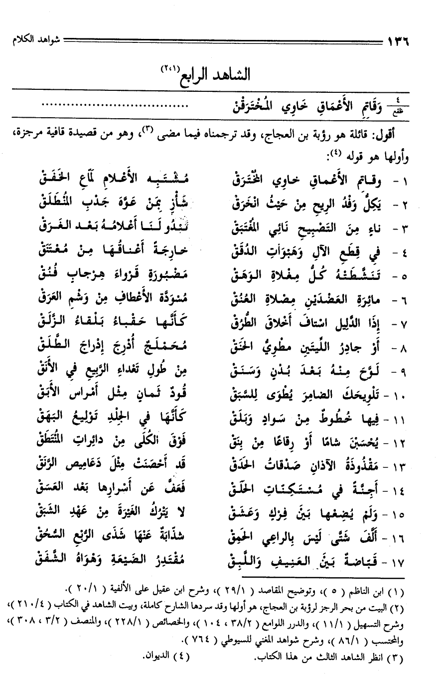(¬2) البيت من بحر الرجز لرؤبة بن الحجاج، هو أولها وقد سردها الشارح كاملة، وبيت الشاهد في الكتاب (4/ 210)، وشرح التسهيل (1/ 11)، والدرر اللوامع (2/ 38، 104)، والخصائص (1/ 228)، والمنصف (2/ 3، 308) والمحتسب (1/ 86)، وشرح شواهد المغني للسيوطي (764).