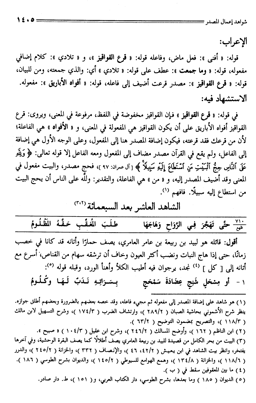 في قوله: "قرع القواقيز" فإن القواقيز مخفوضة في اللفظ، مرفوعة في المعنى، ويروى: قرع القواقيز أفواه الأباريق على أن يكون القواقيز هي المفعولة في المعنى، و"الأفواه" هي الفاعلة؛ لأن من قرعك فقد ترعته، فيكون إضافة المصدر هنا إلى المفعول، وعلى الوجه الأول هي إضافة إلى الفاعل، ولم يقع في القرآن مصدر مضاف إلى المفعول ومعه الفاعل إلا قوله تعالى: {وَلِلَّهِ عَلَى النَّاسِ حِجُّ الْبَيْتِ مَنِ اسْتَطَاعَ إِلَيْهِ سَبِيلًا} [آل عمران: 97]، فحج مصدر، والبيت مفعول في المعنى وقد أضيف المصدر إليه، و"من" هي الفاعلة، والتقدير: ولله على الناس أن يحج البيت من استطاع إليه سبيلًا. فافهم (¬1).