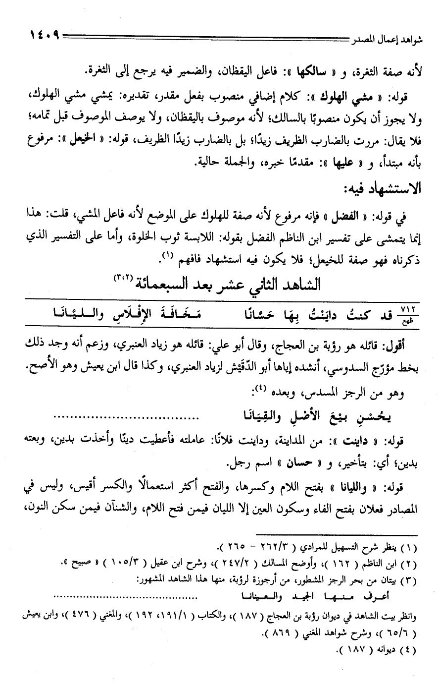 في قوله: "الفضل" فإنه مرفوع لأنه صفة للهلوك على الموضع لأنه فاعل المشي، قلت: هذا إنما يتمشى على تفسير ابن الناظم الفضل بقوله: اللابسة ثوب الخلوة، وأما على التفسير الَّذي ذكرناه فهو صفة للخيعل؛ فلا يكون فيه استشهاد فافهم (¬1).