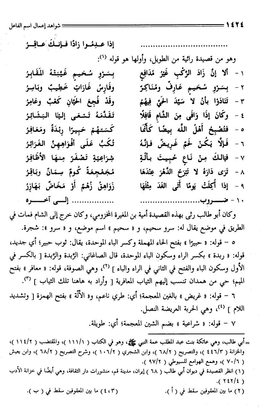 (¬1) انظر القصيدة في ديوان أبي طالب (68) إيران، مدينة قم، منشورات دار الثقافة، وهي أيضًا في خزانة الأدب (4/ 242).