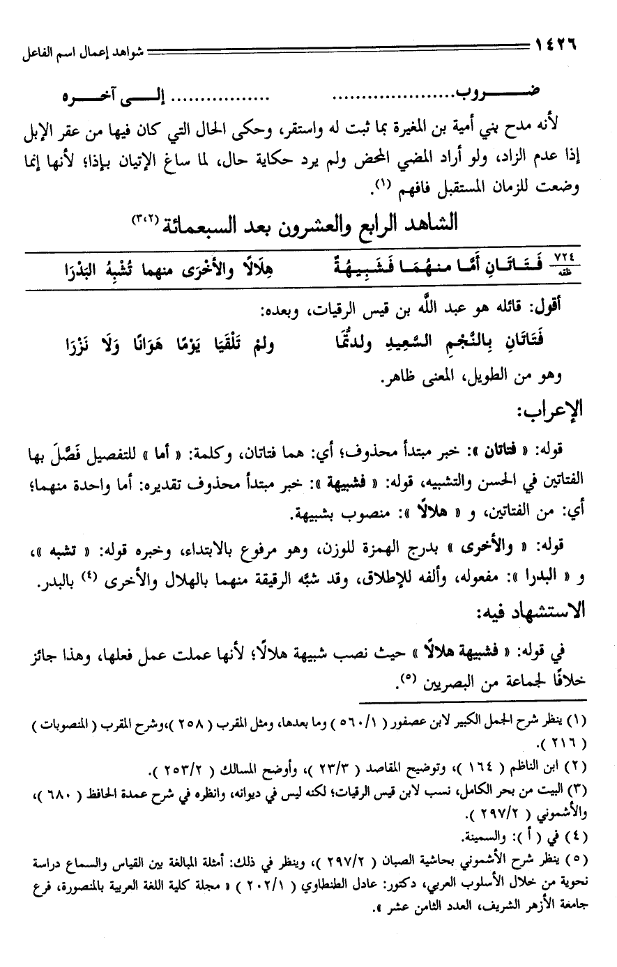 في قوله: "فشبيهة هلالًا" حيث نصب شبيهة هلالًا؛ لأنها عملت عمل فعلها، وهذا جائز خلافًا لجماعة من البصريين (¬5).