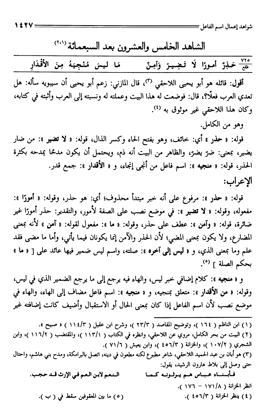 قوله: "حذر": مرفوع على أنَّه خبر مبتدأ محذوف؛ أي: هو حذر، وقوله: "أمورًا": مفعوله، وقوله: "لا تضير": في موضع نصب على الصفة لأمور، والتقدير: حذر أمورًا غير ضائرة، قوله: "وآمن": عطف على حذر، وقوله: "ما": مفعول لقوله: "آمن" لأنه بمعنى المضارع، ولا يكون بمعنى المضي؛ لأن الحذر والآمن إنما يكونان فيما يأتي، وأما ما مضى فقد علم وما بمعنى الَّذي، و"ليس إلى آخره": صلته، واسم ليس ضمير فيها عائد على ["ما" بحكم الصلة] (¬5).