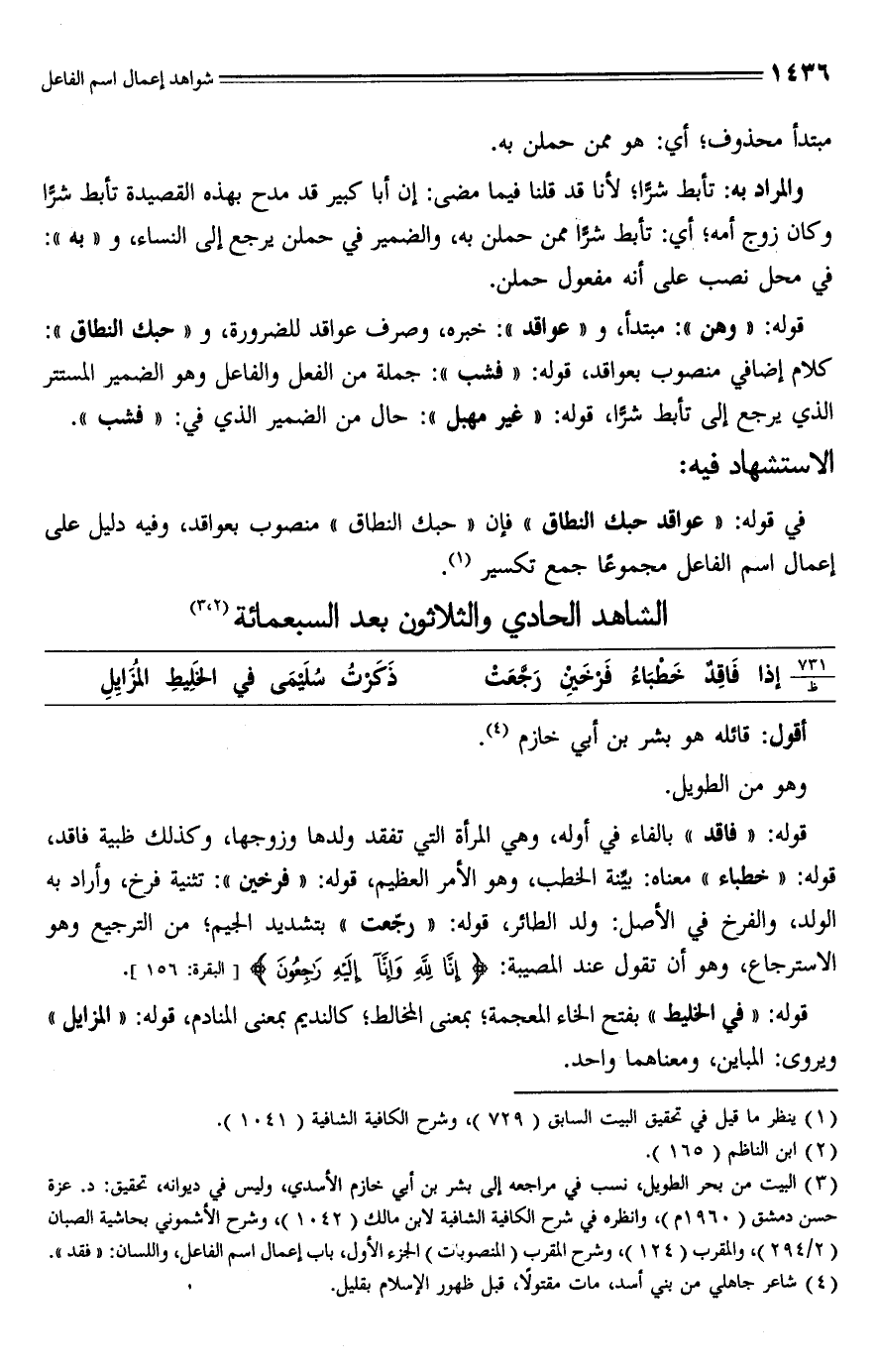 (¬3) البيت من بحر الطويل، نسب في مراجعه إلى بشر بن أبي خازم الأسدي، وليس في ديوانه، تحقيق: د. عزة حسن دمشق (1960 م)، وانظره في شرح الكافية الشافية لابن مالك (1042)، وشرح الأشموني بحاشية الصبان (2/ 294)، والمقرب (124)، وشرح المقرب (المنصوبات) الجزء الأول، باب إعمال اسم الفاعل، واللسان: "فقد".