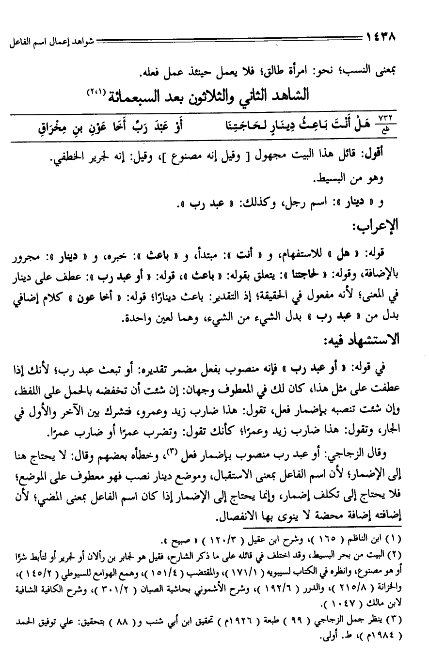 وقال الزجاجي: أو عبد رب منصوب بإضمار فعل (¬3)، وخطأه بعضهم وقال: لا يحتاج هنا إلى الإضمار؛ لأن اسم الفاعل بمعنى الاستقبال، وموضع دينار نصب فهو معطوف على الموضع؛ فلا يحتاج إلى تكلف إضمار، وإنما يحتاج إلى الإضمار إذا كان اسم الفاعل بمعنى المضي؛ لأن إضافته إضافة محضة لا ينوى بها الانفصال.