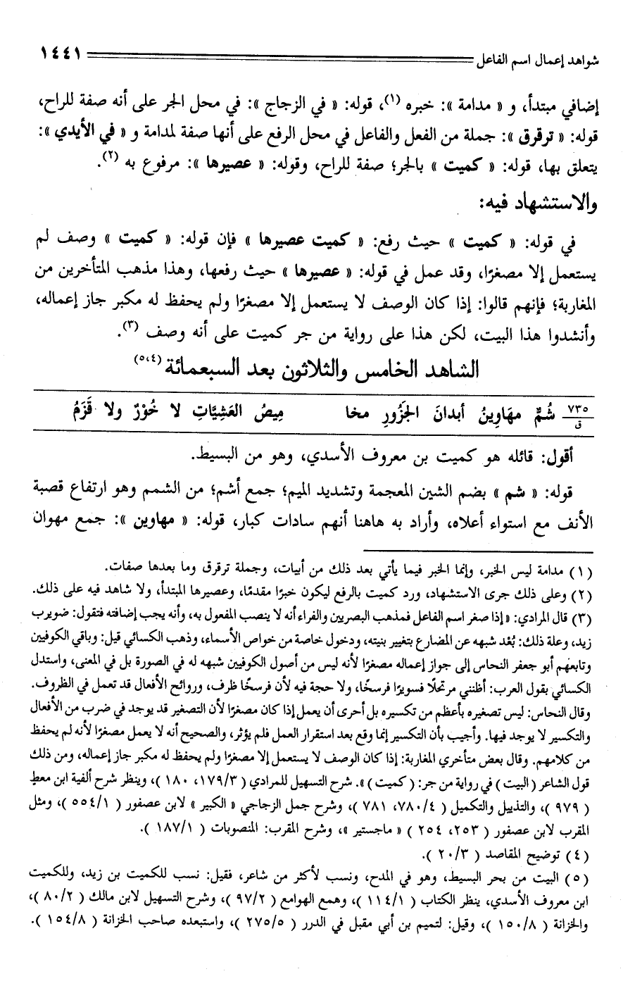 في قوله: "كميت" حيث رفع: "كميت عصيرها" فإن قوله: "كميت" وصف لم يستعمل إلا مصغرًا، وقد عمل في قوله: "عصيرها" حيث رفعها، وهذا مذهب المتأخرين من المغاربة؛ فإنهم قالوا: إذا كان الوصف لا يستعمل إلا مصغرًا ولم يحفظ له مكبر جاز إعماله، وأنشدوا هذا البيت، لكن هذا على رواية من جر كميت على أنَّه وصف (¬3).