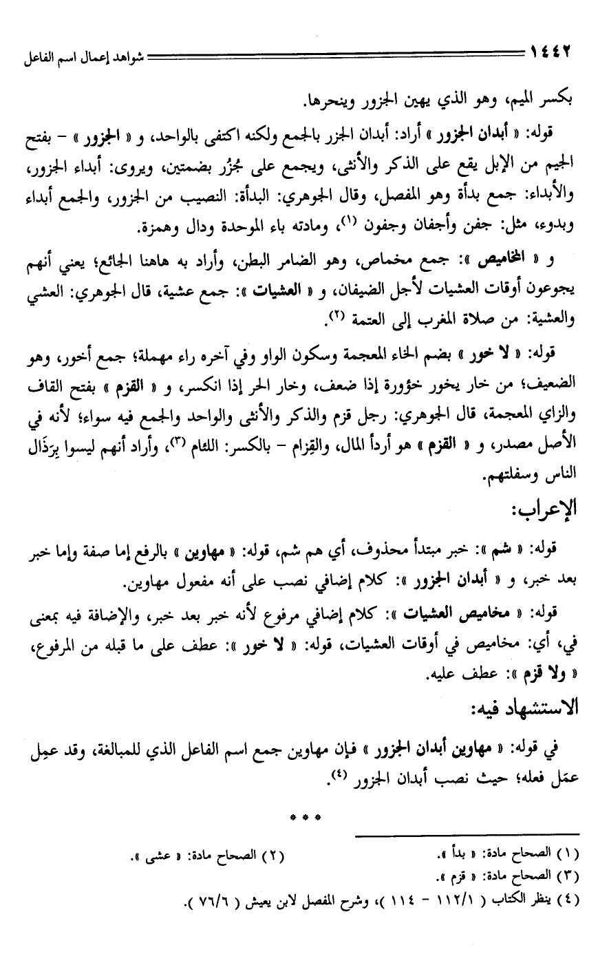 في قوله: "مهاوين أبدان الجزور" فإن مهاوين جمع اسم الفاعل الَّذي للمبالغة، وقد عمِل عمَل فعله؛ حيث نصب أبدان الجزور (¬4).
