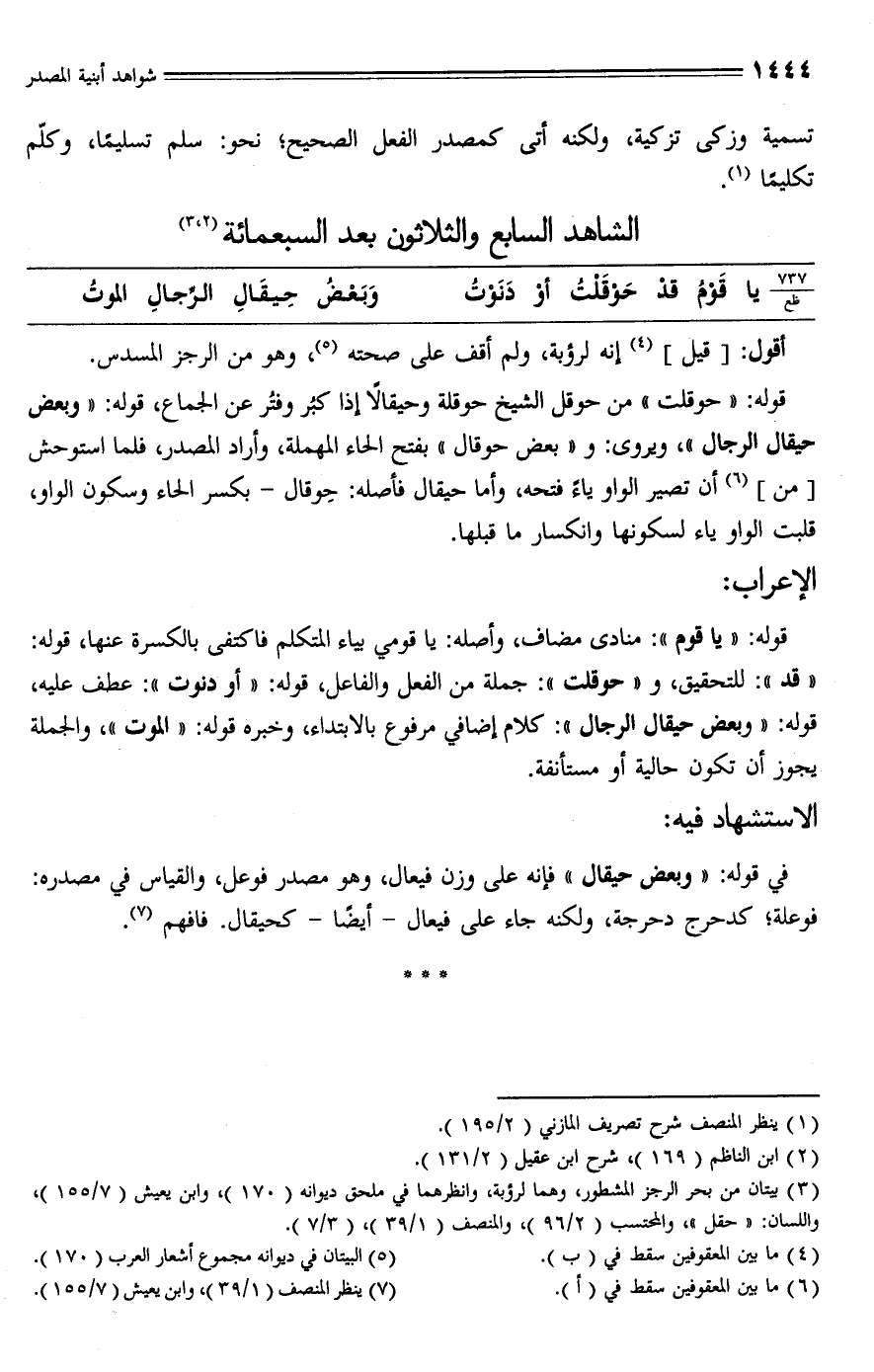 في قوله: "وبعض حيقال" فإنه على وزن فيعال، وهو مصدر فوعل، والقياس في مصدره: فوعلة؛ كدحرج دحرجة، ولكنه جاء على فيعال -أيضًا- كحيقال. فافهم (¬7).