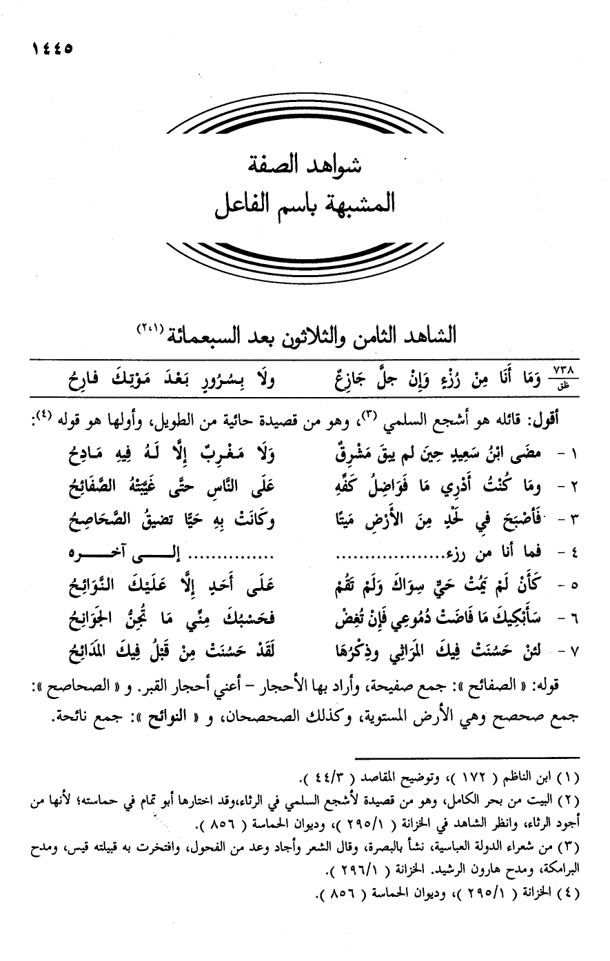 (¬2) البيت من بحر الكامل، وهو من قصيدة لأشجع السلمي في الرثاء، وقد اختارها أبو تمام في حماسته؛ لأنها من أجود الرثاء، وانظر الشاهد في الخزانة (1/ 295)، وديوان الحماسة (856).
