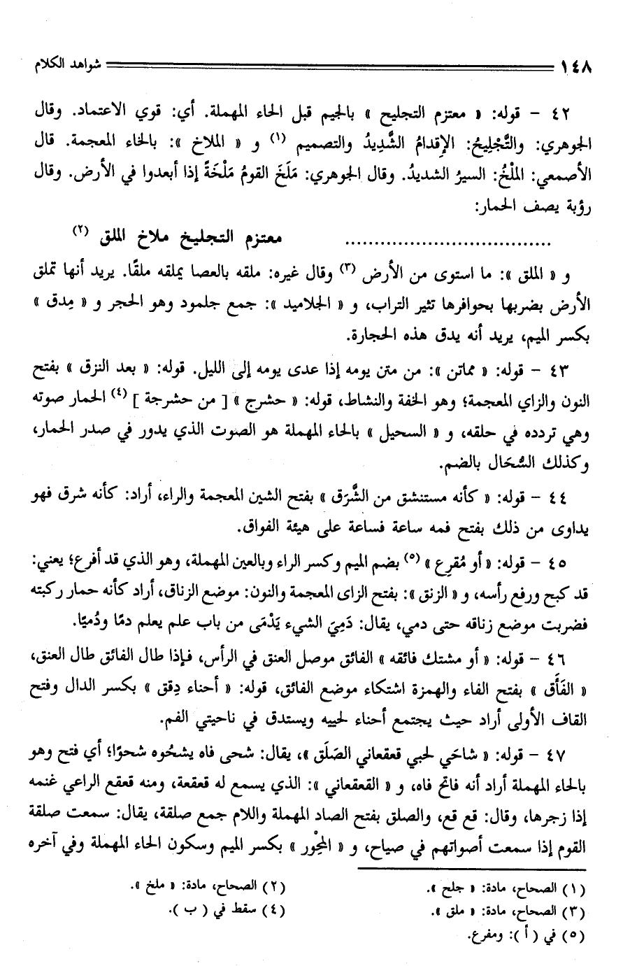 42 - قوله: "معتزم التجليح" بالجيم قبل الحاء المهملة. أي: قوي الاعتماد. وقال الجوهري: والتَّجْلِيحُ: الإِقدامُ الشَّدِيدُ والتصميم (¬1) و"الملاخ": بالخاء المعجمة. قال الأصمعي: الملْخُ: السيرُ الشديدُ. وقال الجوهري: مَلَخَ القومُ مَلْخَةً إذا أبعدوا في الأرض. وقال رؤبة يصف الحمار: