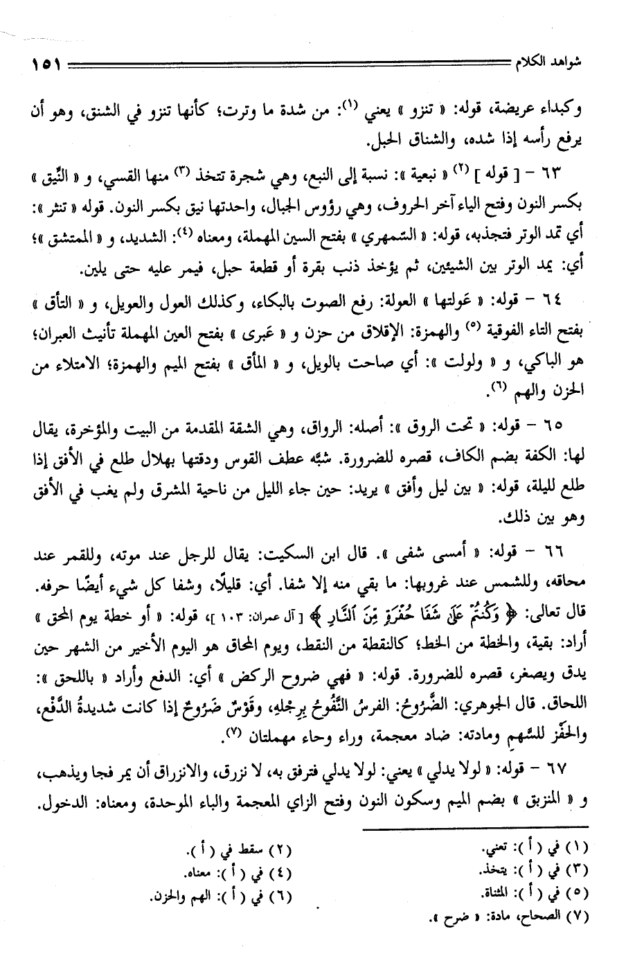 63 - [قوله] (¬2) "نبعية": نسبة إلى النبع، وهي شجرة تتخذ (¬3) منها القسي، و"النِّيق" بكسر النون وفتح الياء آخر الحروف، وهي رؤوس الجبال، واحدتها نيق بكسر النون. قوله "تنثر": أي تمد الوتر فتجذبه, قوله: "السّمهري" بفتح السين المهملة، ومعناه (¬4): الشديد، و"الممتشق"؛ أي: يمد الوتر بين الشيئين، ثم يؤخذ ذنب بقرة أو قطعة حبل، فيمر عليه حتى يلين.