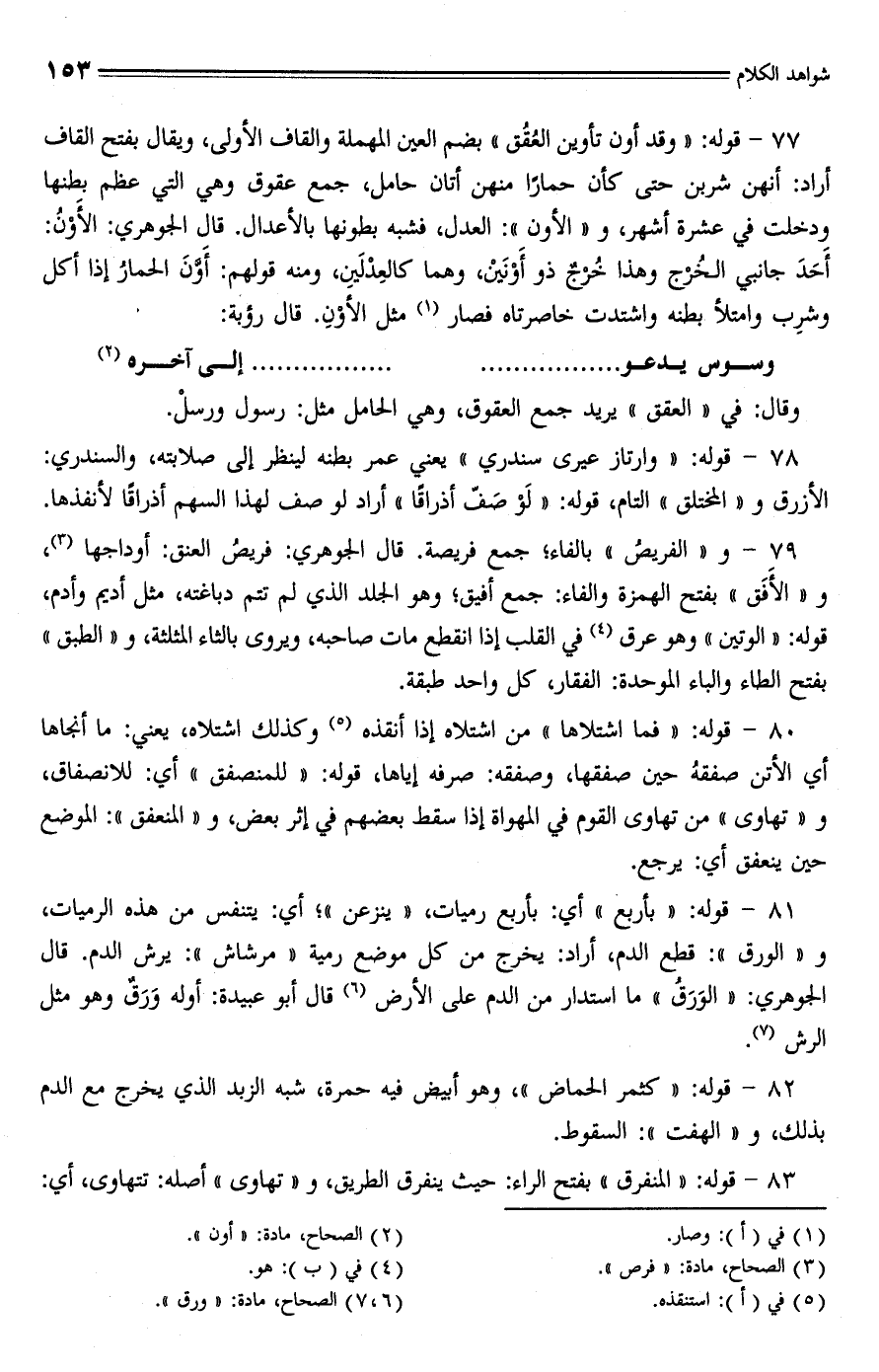 77 - قوله: "وقد أون تأوين العُقُق" بضم العين المهملة والقاف الأولى، ويقال بفتح القاف أراد: أنهن شربن حتى كأن حمارًا منهن أتان حامل، جمع عقوق وهي التي عظم بطنها ودخلت في عشرة أشهر، و"الأون": العدل، فشبه بطونها بالأعدال. قال الجوهري: الأَوْنُ: أَحَدَ جانبي الخُرْج وهذا خُرْجٌ ذو أَوْنَينْ، وهما كالعِدْلَيِن، ومنه قولهم: أَوَّنَ الحمارُ إذا أكل وشرِب وامتلأ بطنه واشتدت خاصرتاه فصار (¬1) مثل الأوْنِ. قال رؤبة: