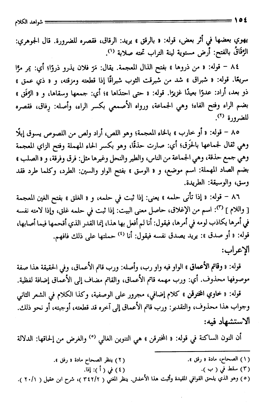 84 - قوله: "من ذروها" بفتح الذال المعجمة. يقال: مَرّ فلان يذرو ذروًا؛ أي: يمر مرًّا سريعًا. قوله: "شبراق" شد من شبرقت الثوب شبراقًا إذا قطعته ومزقته، و"ذي عمق" ذو بعد، أراد: عدوًا بعيدًا غزيرًا. قوله: "حتى احتدَاها"؛ أي: جمعها وسقاها، و"الرُّفَق" بضم الراء وفتح الفاء؛ وهي الجماعة، ورواه الأصمعي بكسر الراء، وأصله: رِفاق، فقصره للضرورة (¬2).