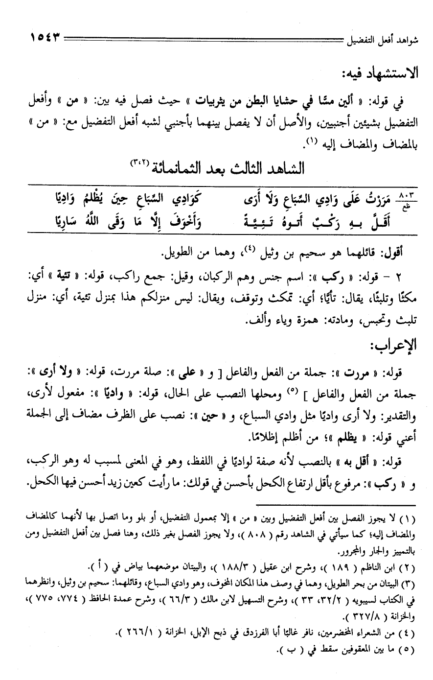 (¬3) البيتان من بحر الطويل، وهما في وصف هذا المكان المخوف، وهو وادي السباع، وقائلهما: سحيم بن وثيل، وانظرهما في الكتاب لسيبويه (2/ 32، 33)، وشرح التسهيل لابن مالك (3/ 66)، وشرح عمدة الحافظ (774، 775)، والخزانة (8/ 327).