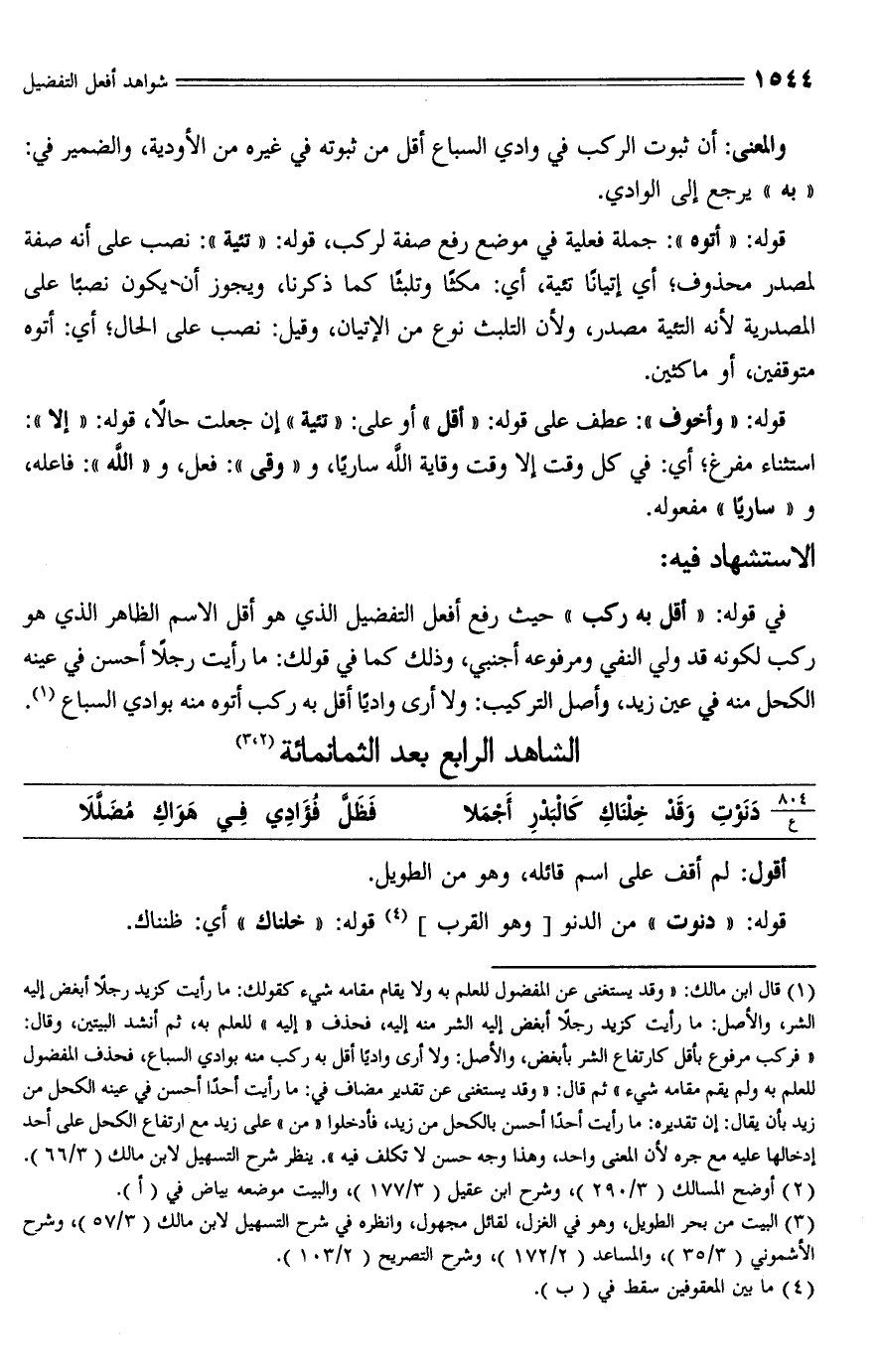 في قوله: "أقل به ركب" حيث رفع أفعل التفضيل الذي هو أقل الاسم الظاهر الذي هو ركب لكونه قد ولي النفي ومرفوعه أجنبي، وذلك كما في قولك: ما رأيت رجلًا أحسن في عينه الكحل منه في عين زيد، وأصل التركيب: ولا أرى واديًا أقل به ركب أتوه منه بوادي السباع (¬1).