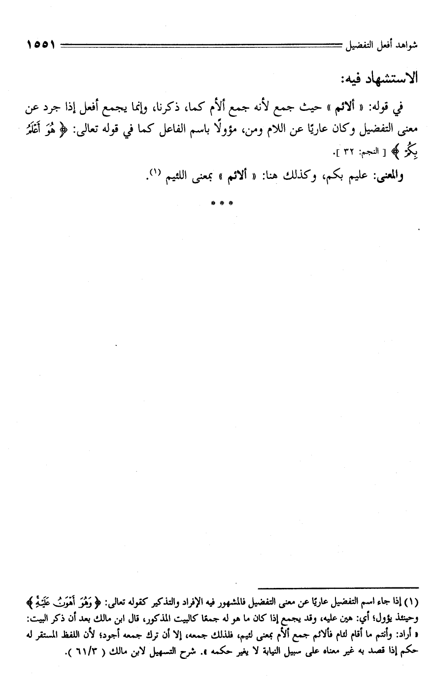 (¬1) إذا جاء اسم التفضيل عاريًا عن معنى التفضيل فالمشهور فيه الإفراد والتذكير كقوله تعالى: {وَهُوَ أَهْوَنُ عَلَيْهِ} وحينئذ يؤول؛ أي: هين عليه، وقد يجمع إذا كان ما هو له جمعًا كالبيت المذكور، قال ابن مالك بعد أن ذكر البيت: "أراد: وأنتم ما أقام لئام فألائم جمع ألأم بمعنى لئيم، فلذلك جمعه، إلا أن ترك جمعه أجود؛ لأن اللفظ المستقر له حكم إذا قصد به غير معناه على سبيل النيابة لا يغير حكمه". شرح التسهيل لابن مالك (3/ 61).