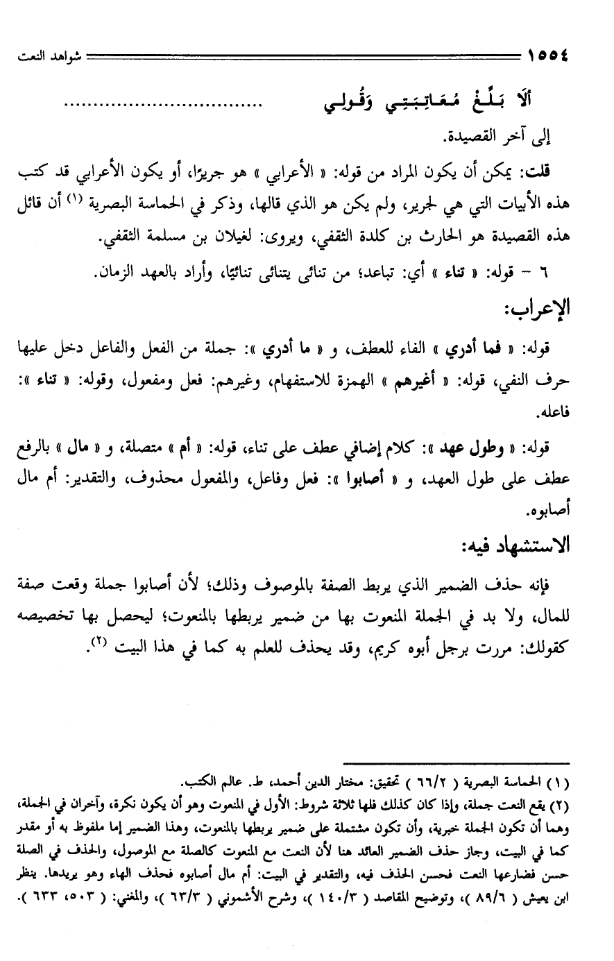 (¬2) يقع النعت جملة، وإذا كان كذلك فلها ثلاثة شروط: الأول في المنعوت وهو أن يكون نكرة، وآخران في الجملة، وهما أن تكون الجملة خبرية، وأن تكون مشتملة على ضمير يربطها بالمنعوت، وهذا الضمير إما ملفوظ به أو مقدر كما في البيت، وجاز حذف الضمير العائد هنا لأن النعت مع المنعوت كالصلة مع الموصول، والحذف في الصلة حسن فضارعها النعت فحسن الحذف فيه، والتقدير في البيت: أم مال أصابوه فحذف الهاء وهو يريدها. ينظر ابن يعيش (6/ 89)، وتوضيح المقاصد (3/ 140)، وشرح الأشموني (3/ 63)، والمغني: (503، 633).