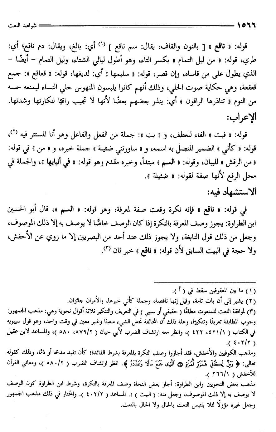 في قوله: "ناقع" فإنه نكرة وقعت صفة لعرفة، وهو قوله: "السم"، قال أبو الحسين بن الطراوة: يجوز وصف المعرفة بالنكرة إذا كان الوصف خاصًّا لا يوصف به إلا ذلك الموصوف، وجعل من ذلك قول النابغة، ولا يجوز ذلك عند أحد من البصريين إلا ما روي عن الأخفش، ولا حجة في البيت السابق لأن قوله: "ناقع" خبر ثان (¬3).