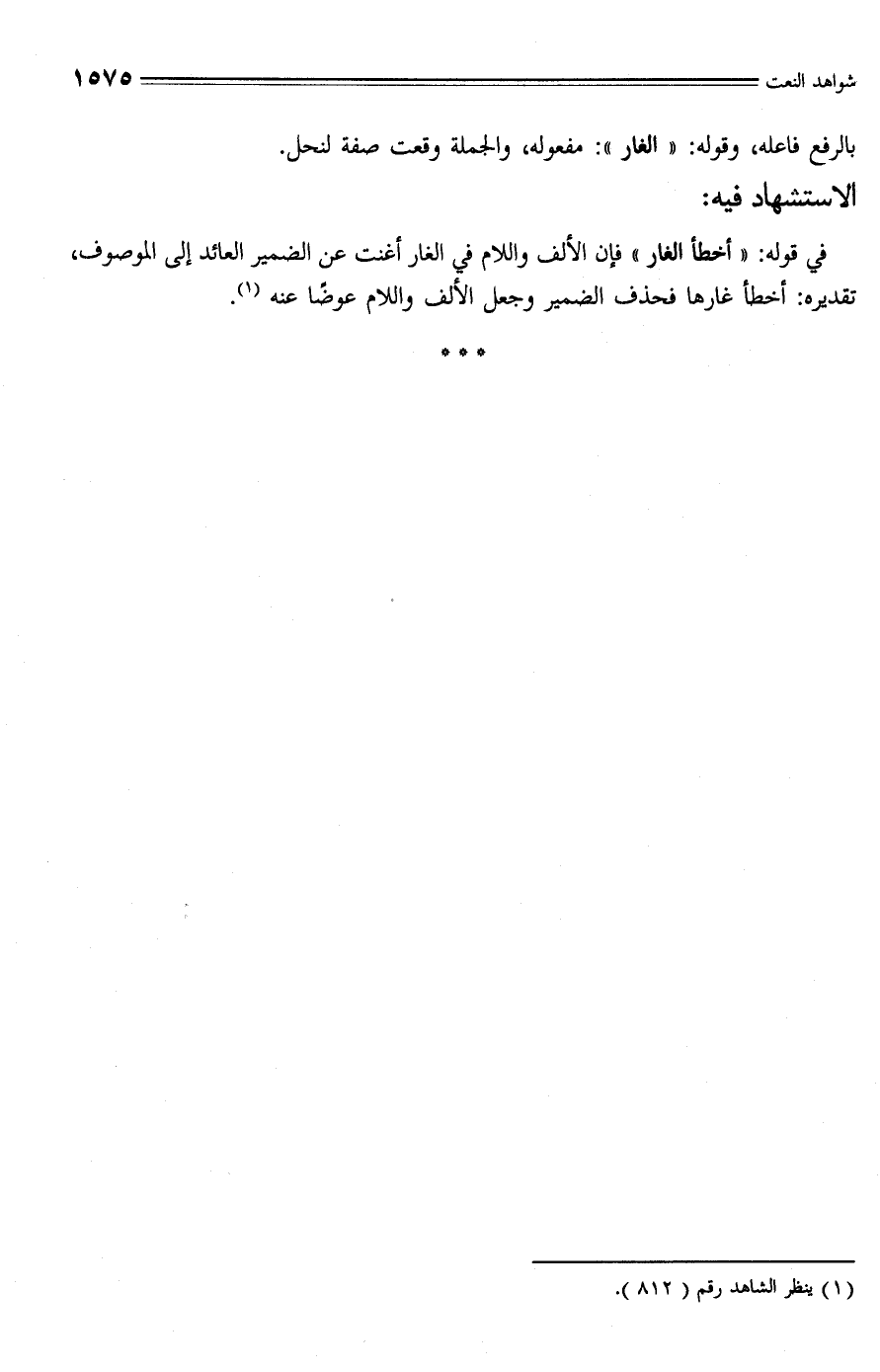 في قوله: "أخطأ الغار" فإن الألف واللام في الغار أغنت عن الضمير العائد إلى الموصوف، تقديره: أخطأ غارها فحذف الضمير وجعل الألف واللام عوضًا عنه (¬1).