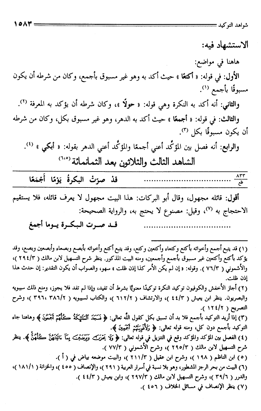 (¬1) قد يتبع أجمع وأخواته بأكتع وكتعاء وأكتعين وكتع، وقد يتبع أكتع وأخواته بأبصع وبصعاء وأبصعين وبصع، وقد يؤكد بأكتع وأكتعين غير مسبوق بأجمع وأجمعين، ومنه البيت المذكور. ينظر شرح التسهيل لابن مالك (3/ 294)، والأشموني (3/ 76). وقوله: "إن لم يكن الأمر كذا إذن ظلت" سهو، والصواب أن يكون التقدير: إن حدث هذا إذن ظلت.