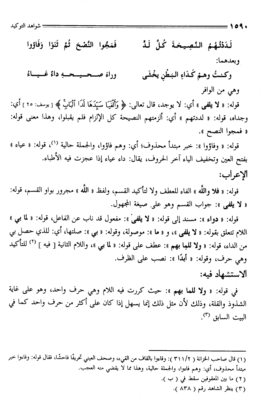 (¬1) قال صاحب الخزانة (2/ 311): وقاءوا بالقاف من القيء، وصحف العيني تحريفًا فاحشًا، فقال قوله: وفاءوا خبر مبتدأ محذوف، أي: وهم فاءوا، والجملة حالية، وهذا مما لا يقضي منه العجب.