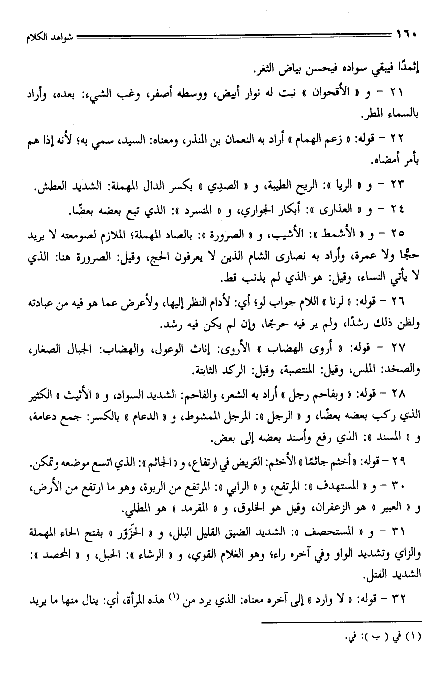 31 - و "المستحصف": الشديد الضيق القليل البلل، و "الحَزَوّر" بفتح الحاء المهملة والزاي وتشديد الواو وفي آخره راء؛ وهو الغلام القوي، و "الرشاء": الحبل، و "المحصد": الشديد الفتل.