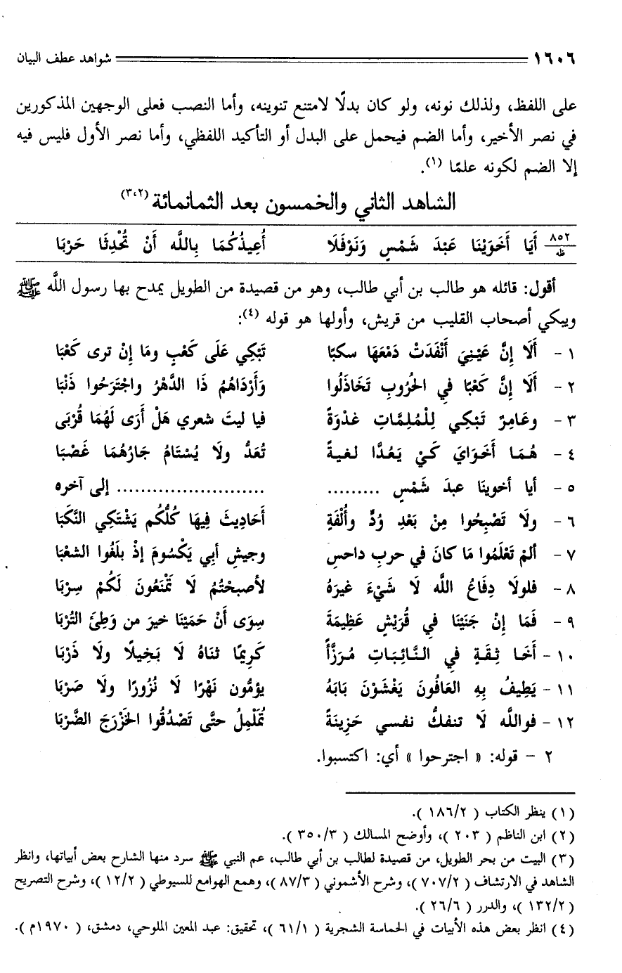 (¬3) البيت من بحر الطويل، من قصيدة لطالب بن أبي طالب، عم النبي - صلى الله عليه وسلم - سرد منها الشارح بعض أبياتها، وانظر الشاهد في الارتشاف (7/ 702)، وشرح الأشموني (3/ 87)، وهمع الهوامع للسيوطي (2/ 12)، وشرح التصريح (2/ 132)، والدرر (6/ 26).
