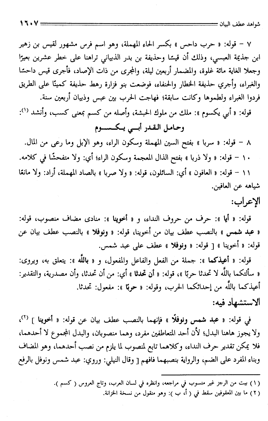 قوله: "أيا": حرف من حروف النداء، و "أخوينا": منادى مضاف منصوب، قوله: "عبد شمسٍ" بالنصب عطف بيان من أخوينا، قوله: "ونوفلا" بالنصب عطف بيان عن قوله: "أخوينا" [قوله: "ونوفلا" عطف على عبد شمس.