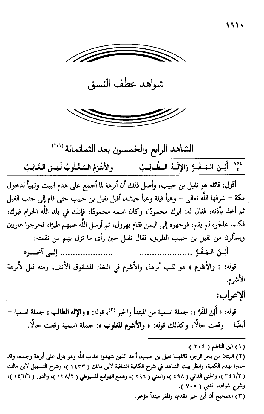 (¬2) البيتان من بحر الرجز، قائلهما نفيل بن حبيب، أحد الذين شهدوا عذاب الله وهو ينزل على أبرهة وجنده، وقد جاءوا لهدم الكعبة، وانظر بيت الشاهد في شرح الكافية الشافية لابن مالك (1433)، وشرح التسهيل لابن مالك (3/ 346)، والجنى الداني (498)، والمغني (296)، وهمع الهوامع للسيوطي (2/ 138)، والدرر (6/ 146)، وشرح شواهد المغني (705).