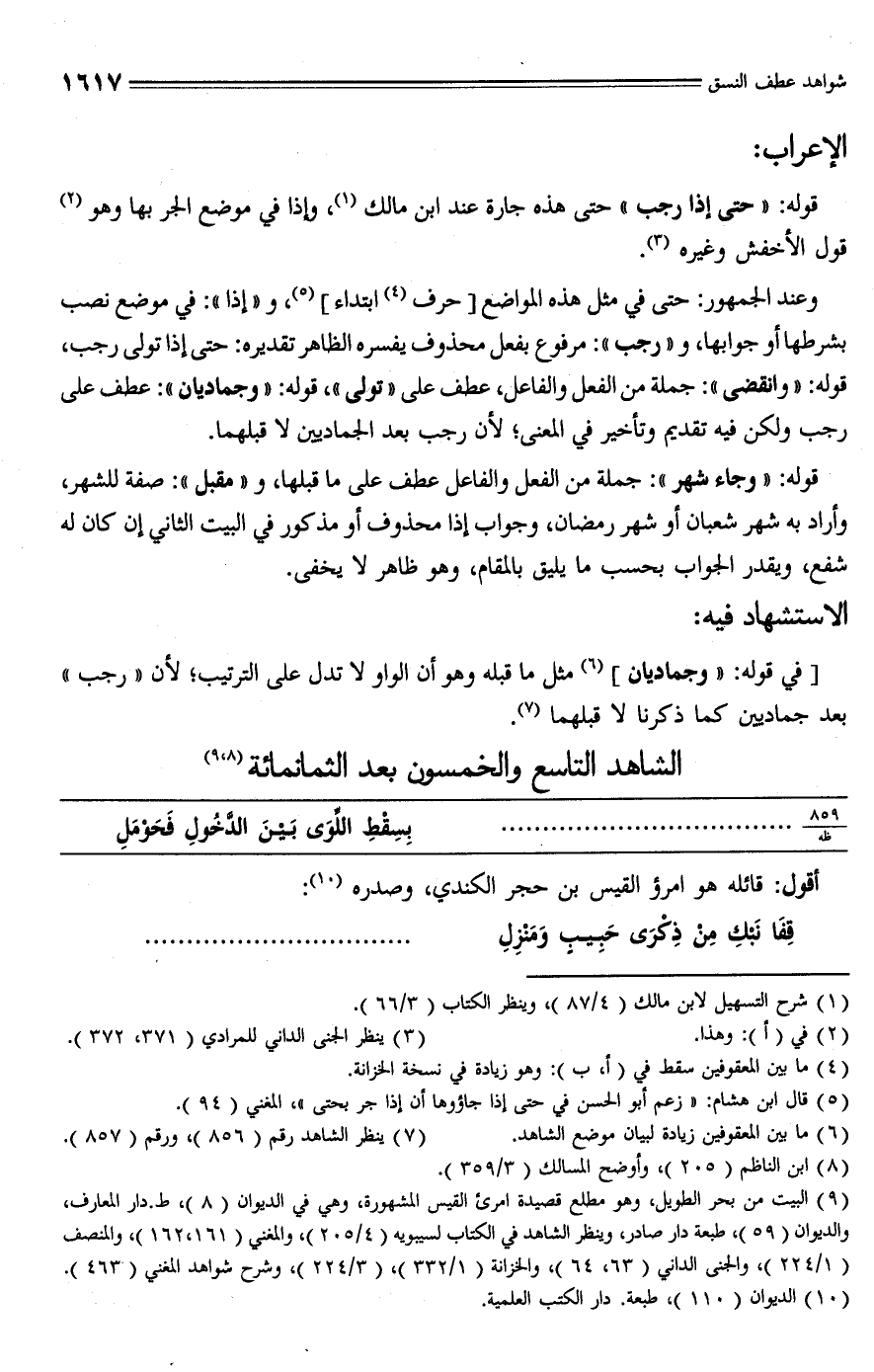 (¬9) البيت من بحر الطويل، وهو مطلع قصيدة امرئ لقيس المشهورة، وهي في الديوان (8)، ط. دار المعارف، والديوان (59)، طبعة دار صادر، وينظر الشاهد في الكتاب لسيبويه (4/ 205)، والمغني (161، 162)، والمنصف (1/ 224)، والجنى الداني (63، 64)، والخزانة (1/ 332)، (3/ 224)، وشرح شواهد المغني (463).