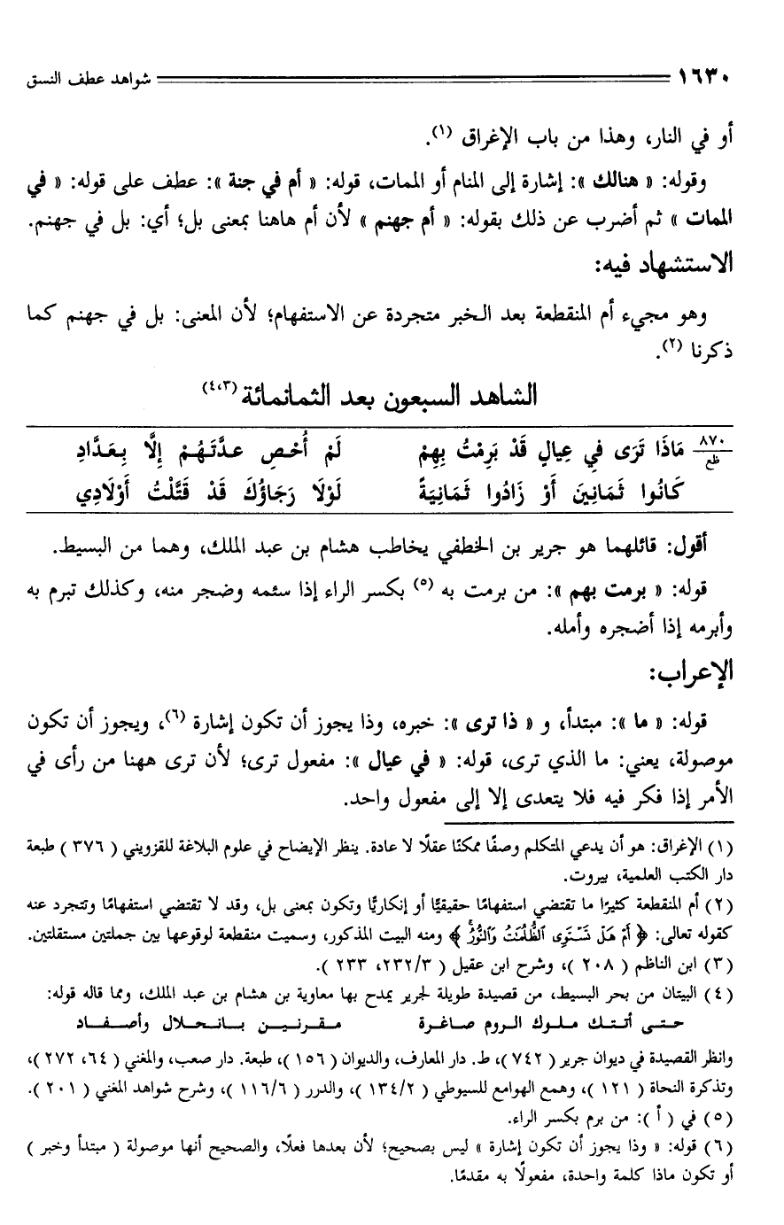 (¬2) أم المنقطعة كثيرًا ما تقتضي استفهامًا حقيقيًّا أو إنكاريًّا وتكون بمعنى بل، وقد لا تقتضي استفهامًا وتتجرد عنه كقوله تعالى: {أَمْ هَلْ تَسْتَوي الظُّلُمَاتُ وَالنُّورُ} ومنه البيت المذكور، وسميت منقطعة لوقوعها بين جملتين مستقلتين.