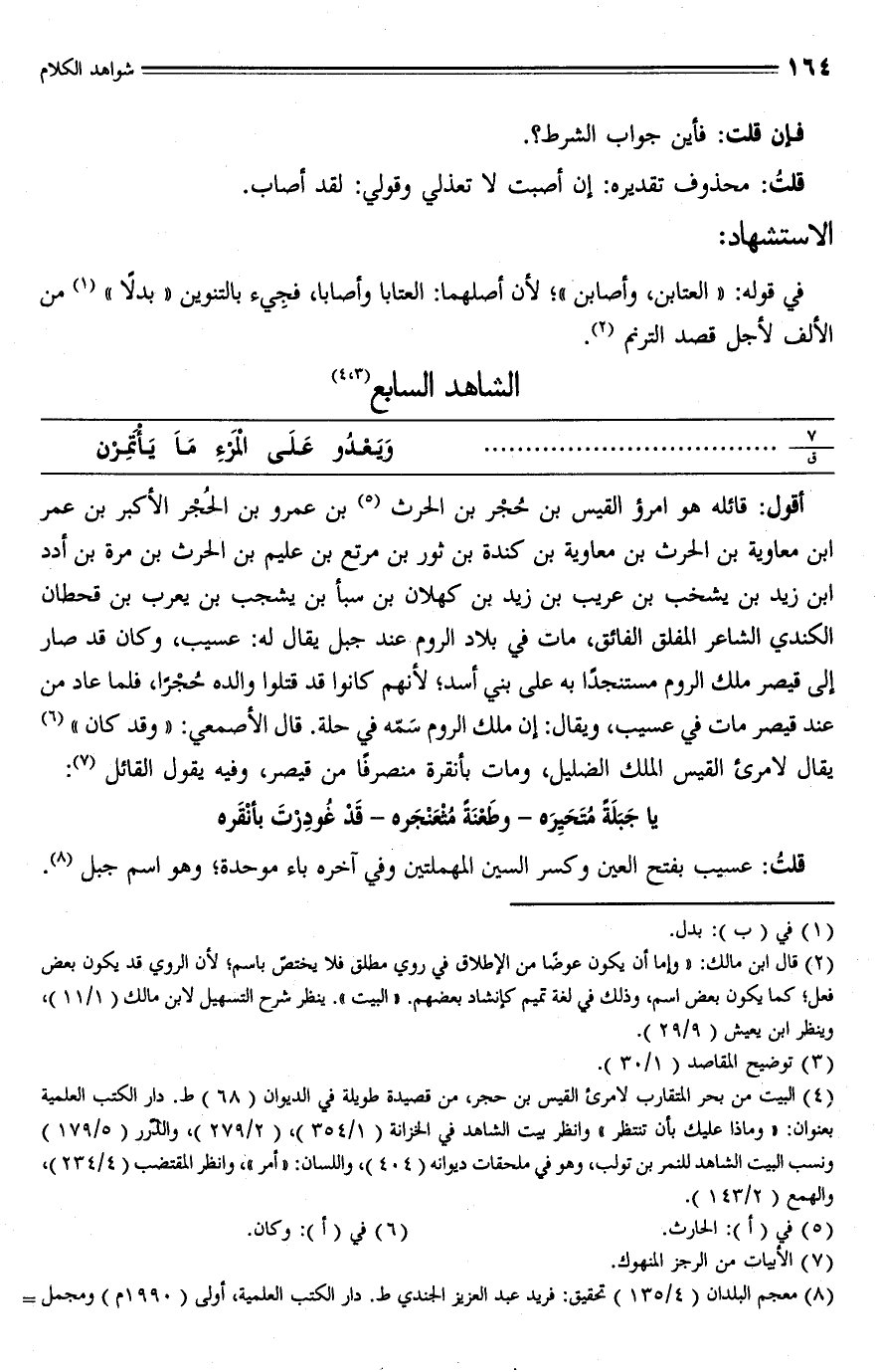 (¬4) البيت من بحر المتقارب لامرئ القيس بن حجر، من قصيدة طويلة في الديوان (68) ط. دار الكتب العلمية بعنوان: "وماذا عليك بأن تنتظر" وانظر بيت الشاهد في الخزانة (1/ 354)، (2/ 279)، والدّرر (5/ 179) ونسب البيت الشاهد للنمر بن تولب، وهو في ملحقات ديوانه (404)، واللسان: "أمر", وانظر المقتضب (4/ 234)، والهمع (2/ 143).