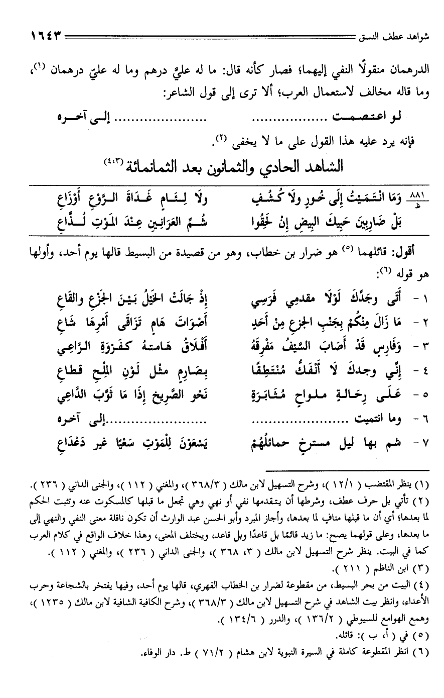 (¬4) البيت من بحر البسيط، من مقطوعة لضرار بن الخطاب الفهري، قالها يوم أحد، وفيها يفتخر بالشجاعة وحرب الأعداء، وانظر بيت الشاهد في شرح التسهيل لابن مالك (3/ 368)، وشرح الكافية الشافية لابن مالك (1235)، وهمع الهوامع للسيوطي (2/ 136)، والدرر (6/ 134).