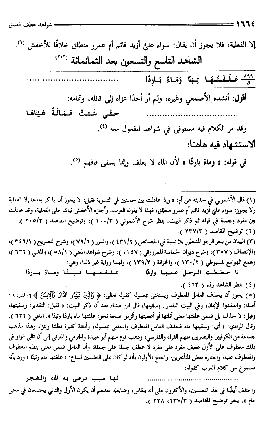 (¬5) يجوز أن يحذف العامل المعطوف ويستغنى بمعموله كقوله تعالى: {وَالَّذِينَ تَبَوَّءُوا الدَّارَ وَالْإِيمَانَ} [الحشر: 9] أصله: واعتقدوا الإيمان، وفي البيت التقدير: وسقيتها، قال ابن هشام بعد أن ذكر البيت: "فقيل: التقدير: وسقيتها، وقيل: لا حذف بل ضمن علفتها معنى أنلتها أو أعطيتها وألزموا صحة نحو: علفتها ماء باردًا وتبنًا". المغني (632). وقال المرادي: "أي: وشيتها ماء فحذف العامل المعطوف واستغنى بمعموله، وأمثلة كثيرة نظمًا ونثرًا، وهذا مذهب جماعة من الكوفيين والبصريين منهم الفراء والفارسي، وذهب قوم منهم أبو عبيدة والحرمي والمازني إلى أن تالي الواو في ذلك معطوف على الأول عطف مفرد على مفرد لا عطف جملة على جملة، وأن العامل ضمن معنى ينظم المعطوف والمعطوف عليه، واختاره بعض المتأخرين، واحتج الأولون بأنه لو كان على التضمين لساغ: "علفتها ماء وتبنًا" ورد بأنه مسموع من كلام العرب كقوله: