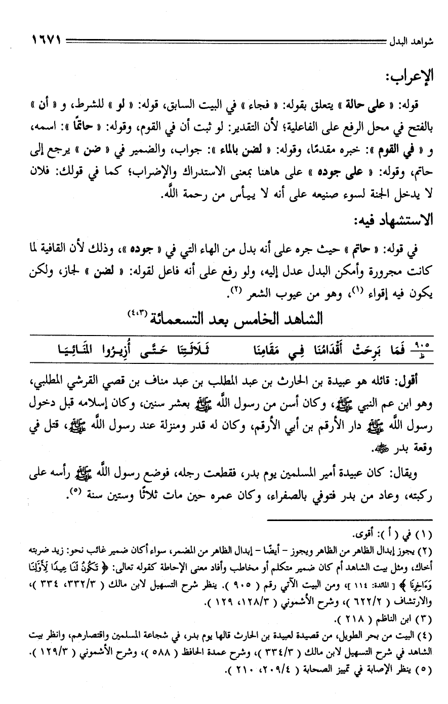 (¬4) البيت من بحر الطويل، من قصيدة لعبيدة بن الحارث قالها يوم بدر، في شجاعة المسلمين واقتصارهم، وانظر بيت الشاهد في شرح التسهيل لابن مالك (3/ 334)، وشرح عمدة الحافظ (588)، وشرح الأشموني (3/ 129).