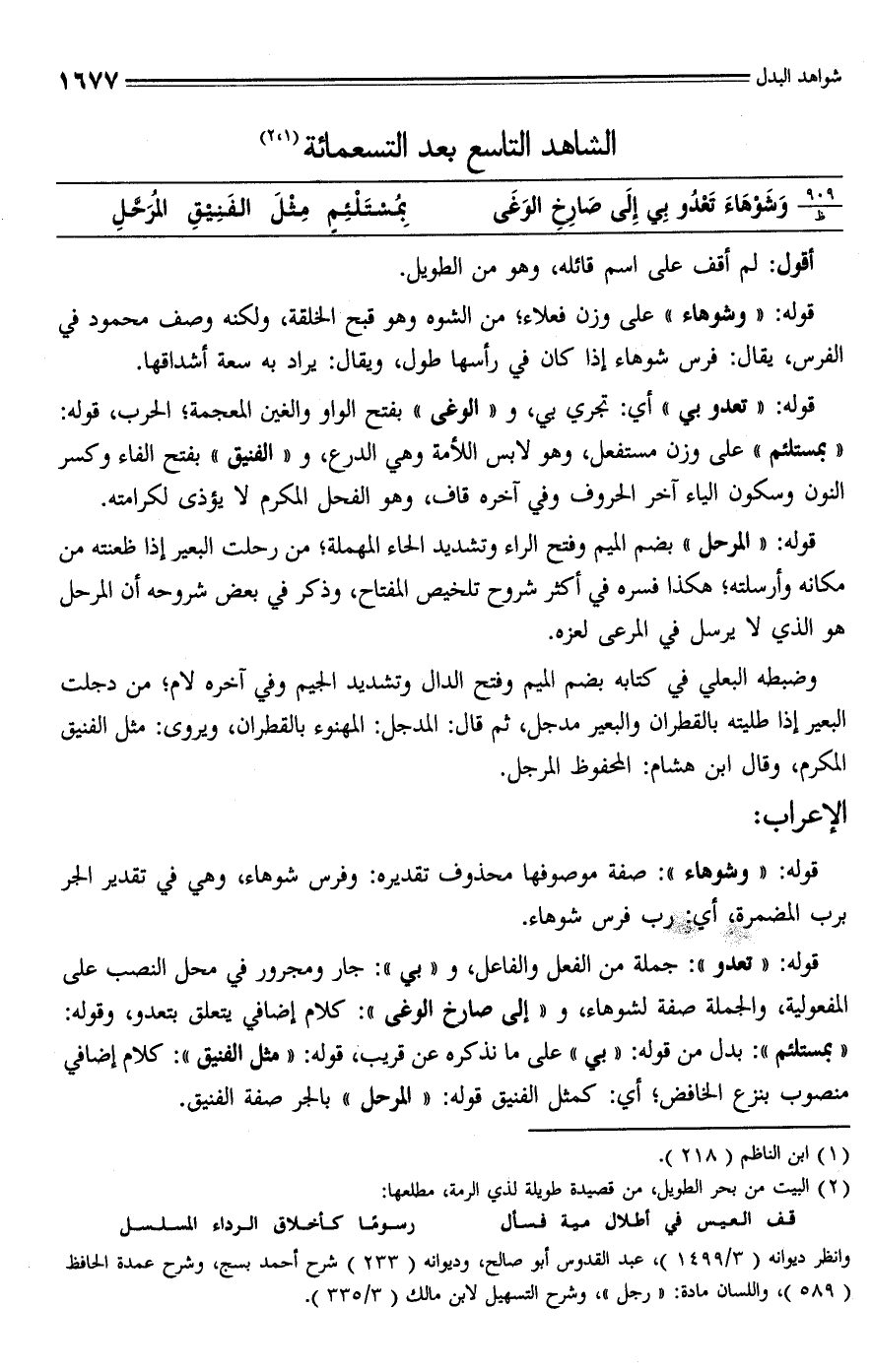 قوله: "تعدو": جملة من الفعل والفاعل، و"بي": جار ومجرور في محل النصب على المفعولية، والجملة صفة لشوهاء، و"إلى صارخ الوغى": كلام إضافي يتعلق بتعدو، وقوله: "بمستلئم": بدل من قوله: "بي" على ما نذكره عن قريب، قوله: "مثل الفنيق": كلام إضافي منصوب بنزع الخافض؛ أي: كمثل الفنيق قوله: "المرحل" بالجر صفة الفنيق.