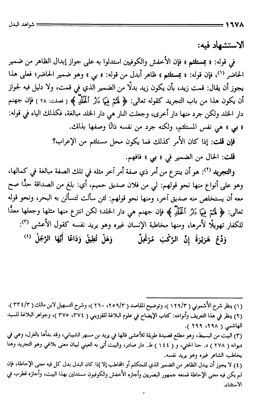 (¬4) لا يجوز أن يبدل الظاهر من الضمير الذي للمتكلم أو المخاطب إلا إذا كان البدل بدل كل فيه معنى الإحاطة، فإن لم يكن فيه معنى الإحاطة فمنعه جمهور البصريين وأجازه الأخفش والكوفيون مستدلين بهذا البيت، وأجازه قطرب في الاستثناء.