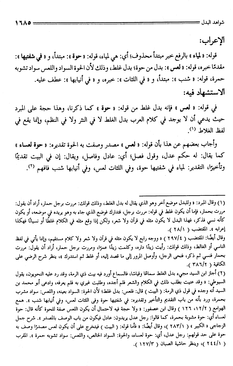 (¬2) أجاز ابن السيد مجيء بدل الغلط سماعًا وقياسًا، فالسماع أورد فيه بيت ذي الرمة، وقد رد عليه النحويون، يقول السيوطي: "وقد عنيت بطلب ذلك في الكلام والشعر فلم أجده، وطلبت غيري به فلم يعرفه، وادعى أبو محمد بن السيد أنه وجده في قول ذي الرمة: (البيت) قال: فلعس: بدل غلط؛ لأن الحوة: السواد بعينه، واللعس: سواد مشرب بحمرة، ورد بأنه من باب التقديم والتأخير وتقديره: في شفتيها حوة وفي اللثات لعس، وفي أنيابها شنب". همع الهوامع (2/ 12، 126) وقال ابن عصفور: "ولا حجة فيه لاحتمال أن يكون اللعس صفة للحوة كأنه قال: حوة لعساء أي: حوة مشوبة بحمرة، كما قالوا: رجل عدل يريدون: عادل فيكون من باب الوصف بالمصدر". شرح جمل الزجاجي "الكبير" (1/ 283)، وقال أيضًا: "فأما قوله: (البيت) فيتخرج على أن يكون لعس مصدرًا وصف به حوة على حد قولهم: رجل عدل، أي: حوة لعساء، والحوة: السواد الخالص، واللعس: سواد تشوبه حمرة". المقرب (1/ 244)، وينظر حاشية الصبان (3/ 127).